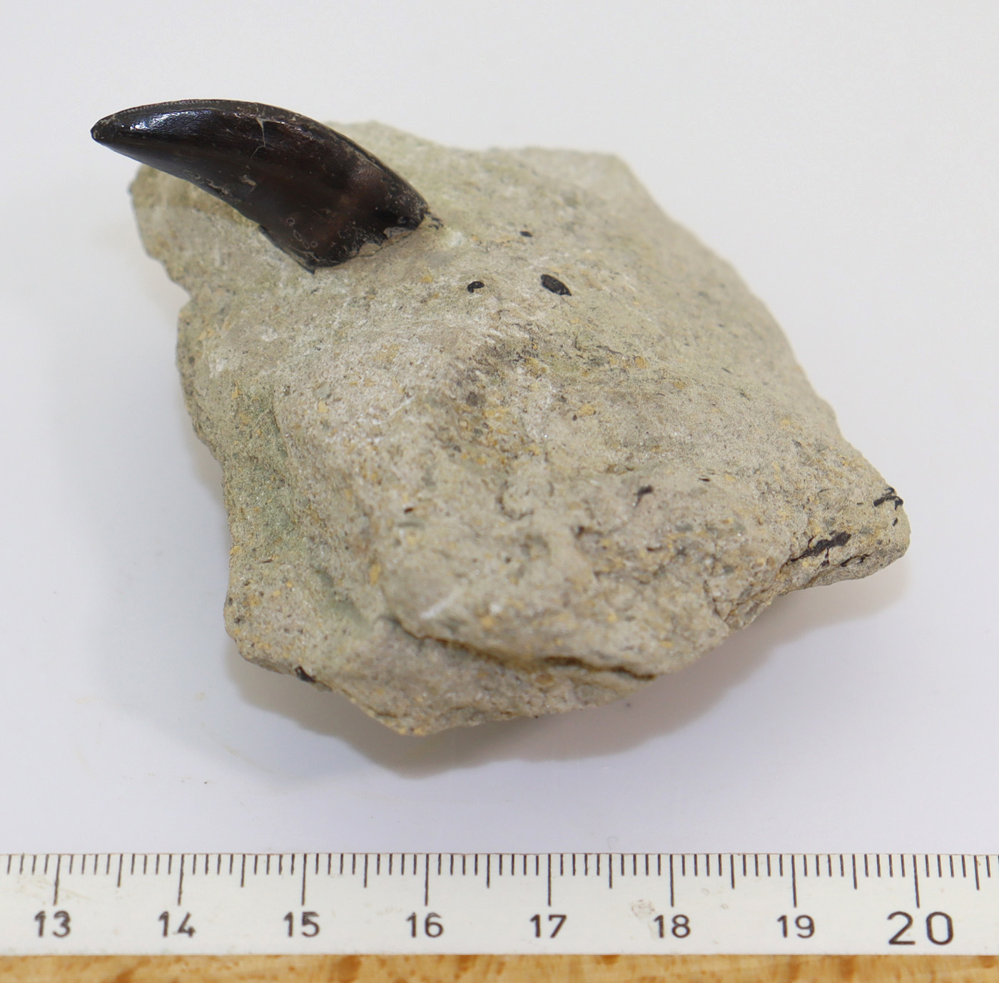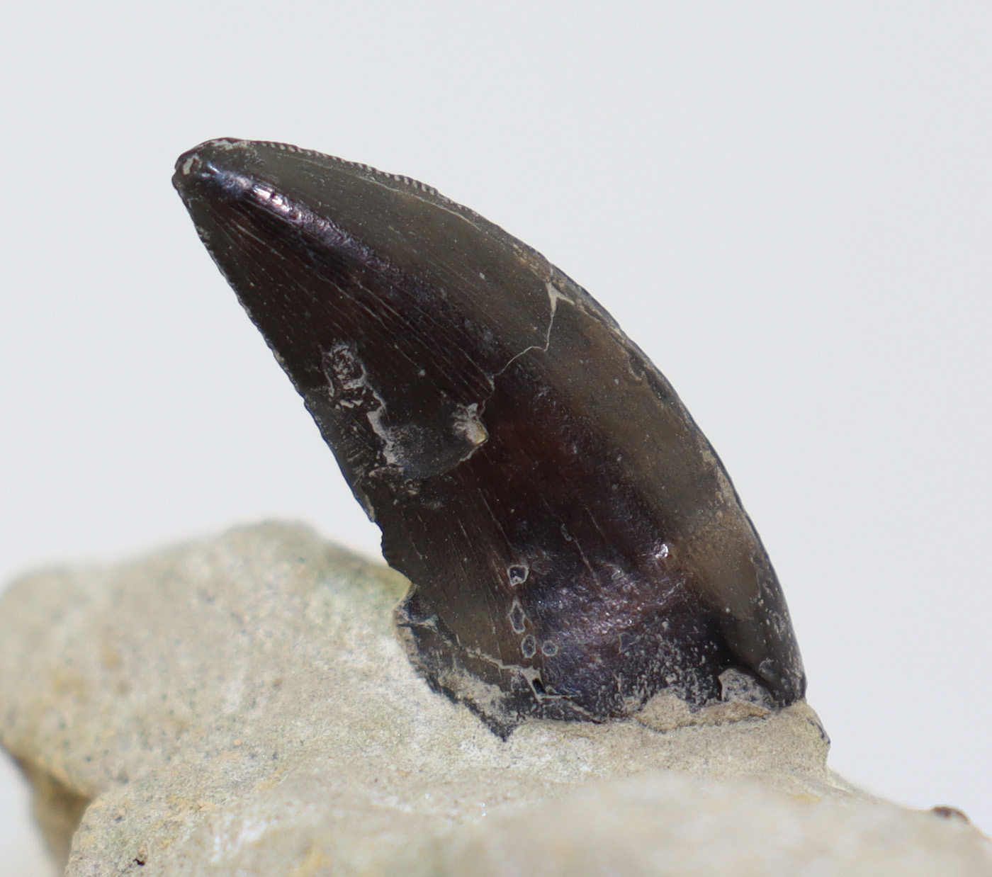 Sehr gut erhaltener, absolut seltener Zahn eines theropoden Dinosauriers auf ein wenig Matrix.