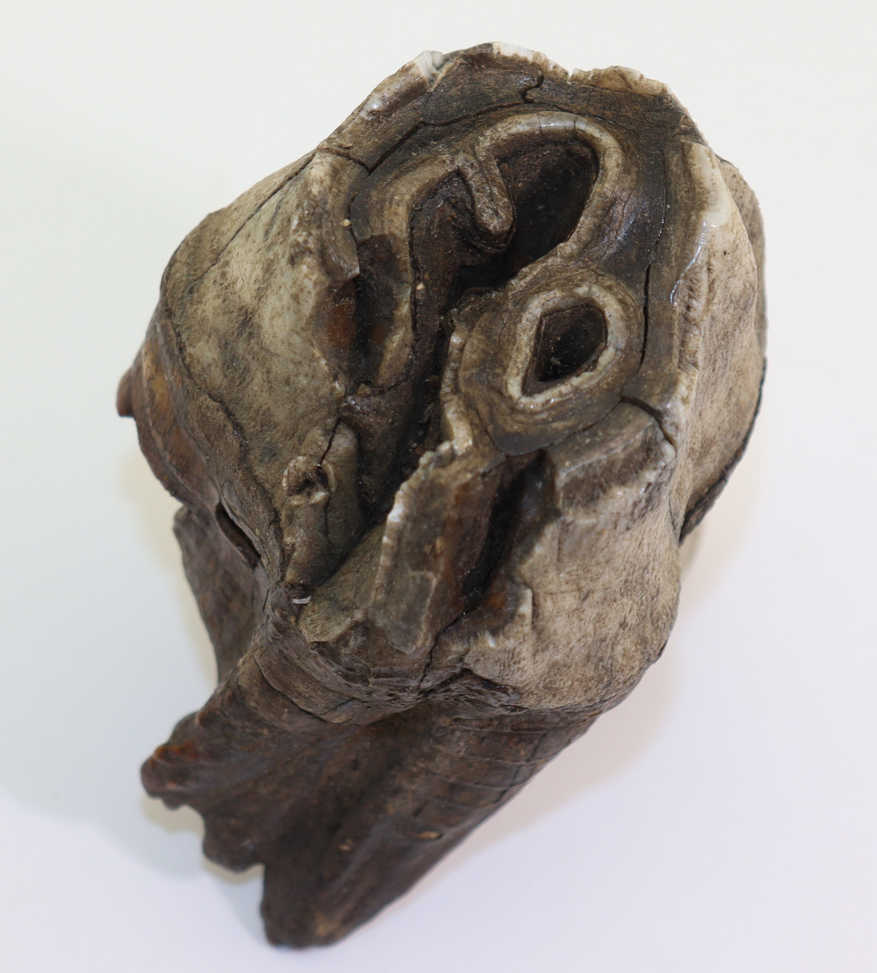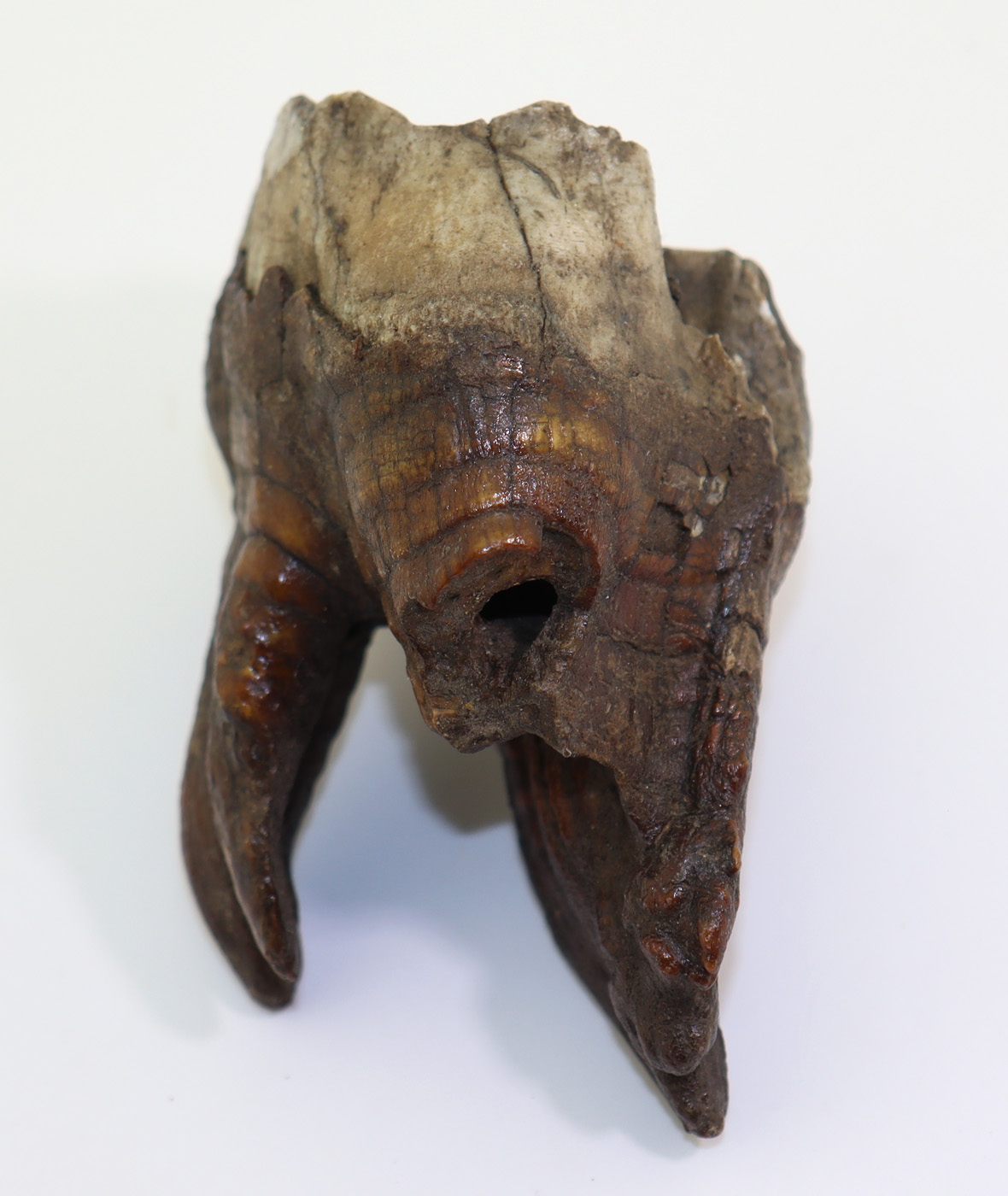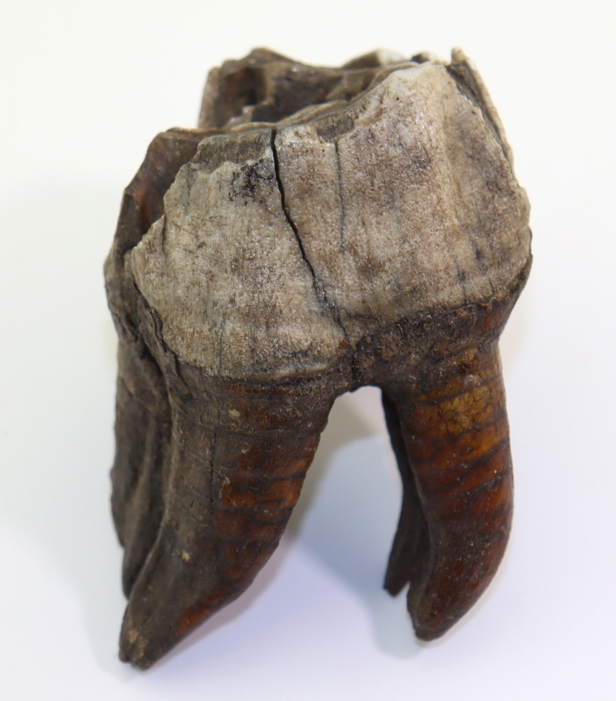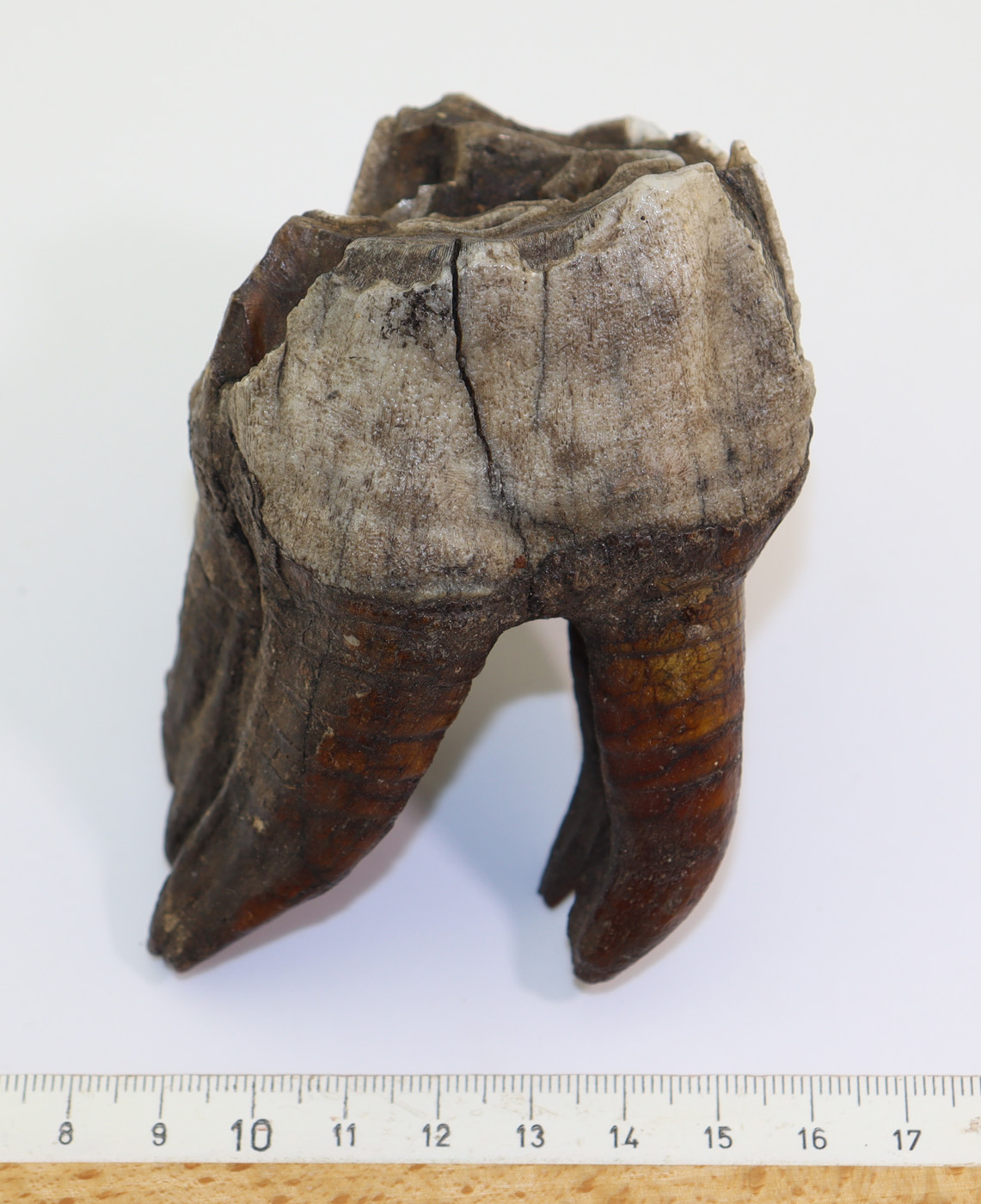 Sehr gut erhaltener Zahn mit Wurzel eines Wollnashornes. Schöne Kaufläche und gut erhaltener Zahnschmelz.