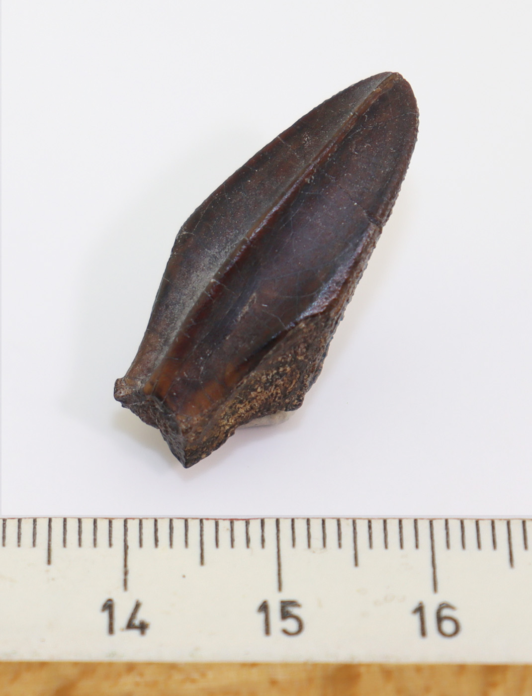 Hervorragend erhaltener Zahn eines Hadrosauriers der zu den Lambeosaurinae gezählt wird.