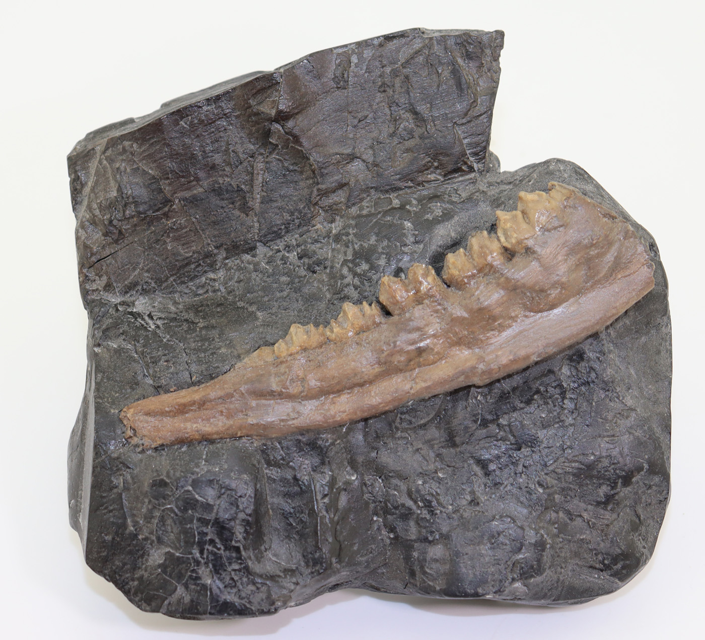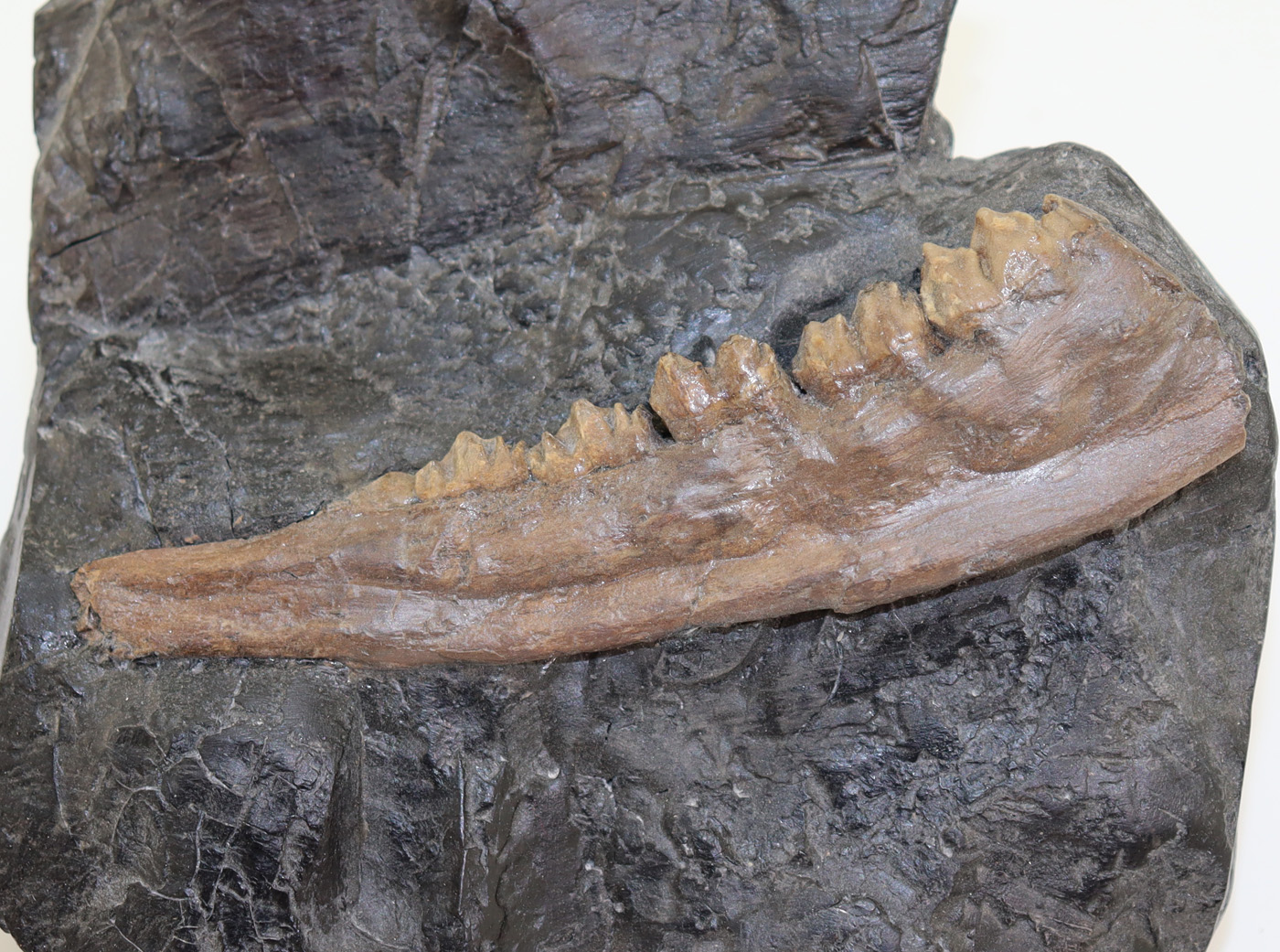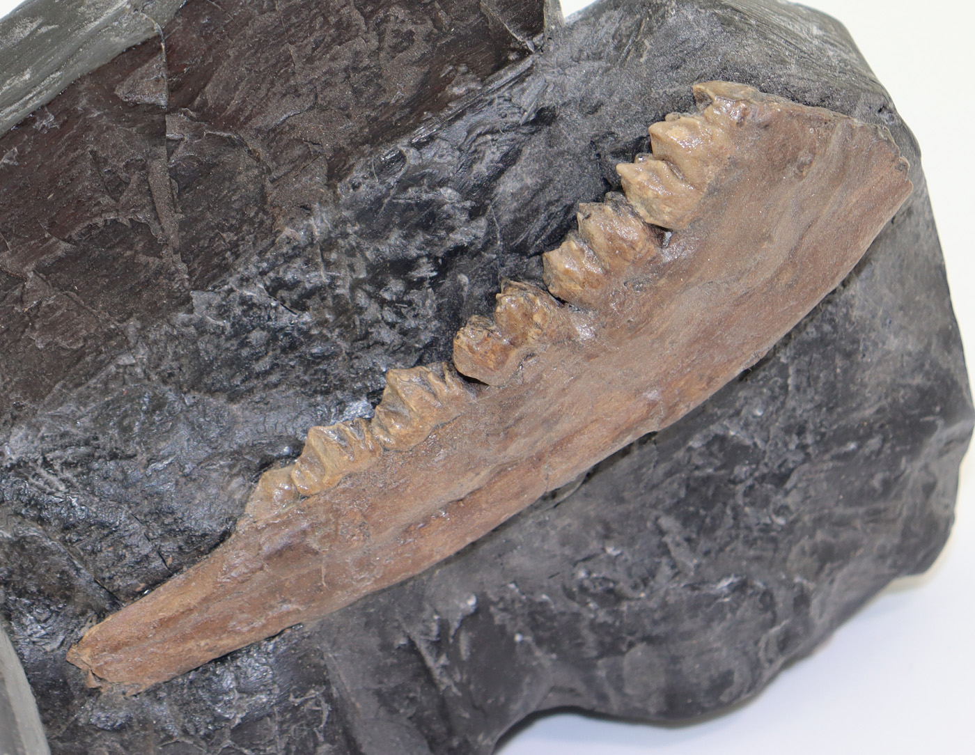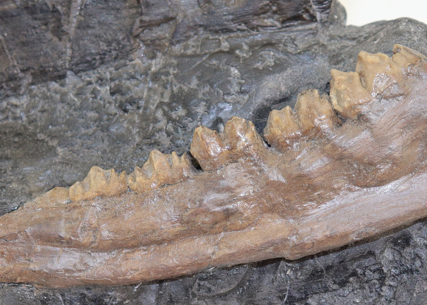 Sehr gut erhaltene Unterkieferast eines hirschartigen Säugetieres auf ein wenig Matrix.