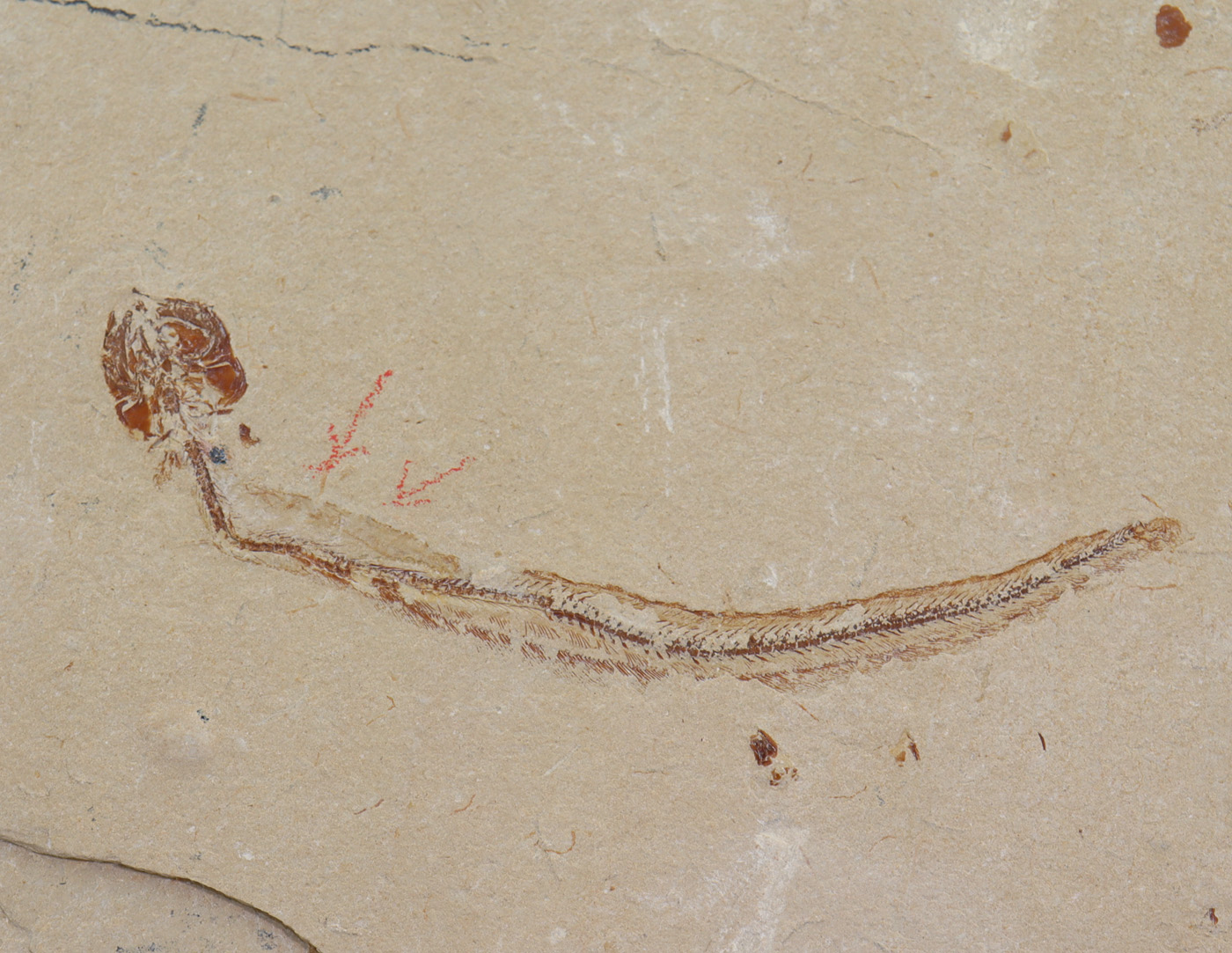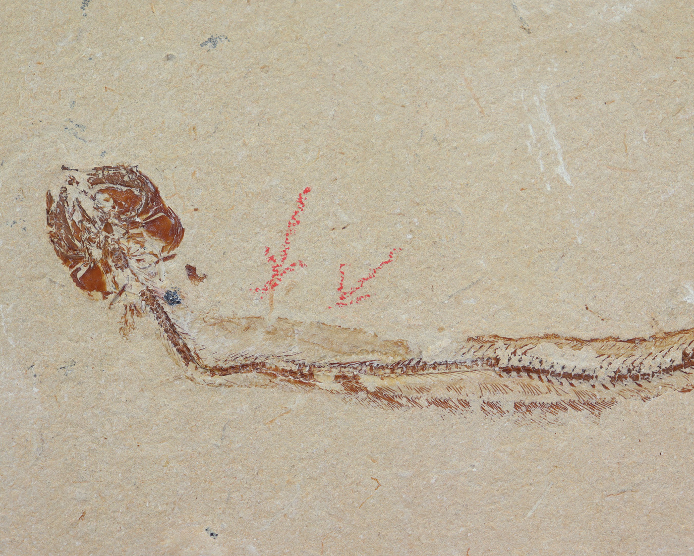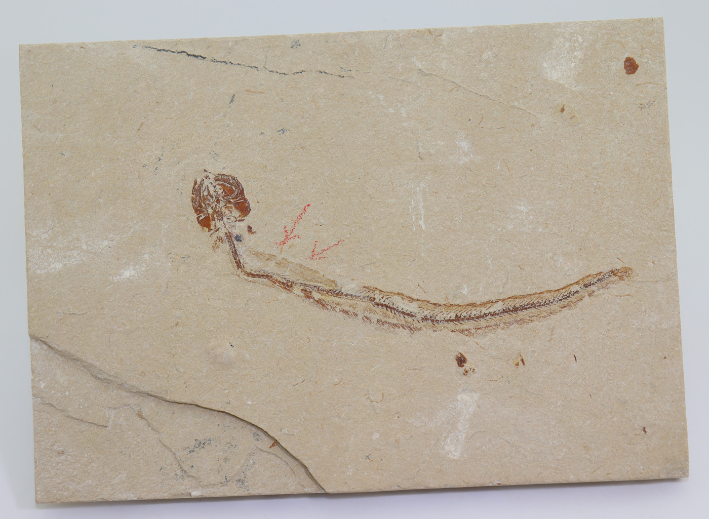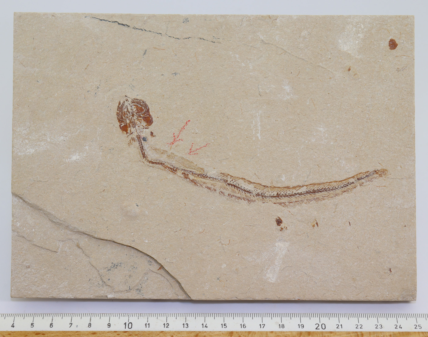 Sehr gut erhaltener aalartiger Fisch auf formatierter Matrix mit Mageninhalt.