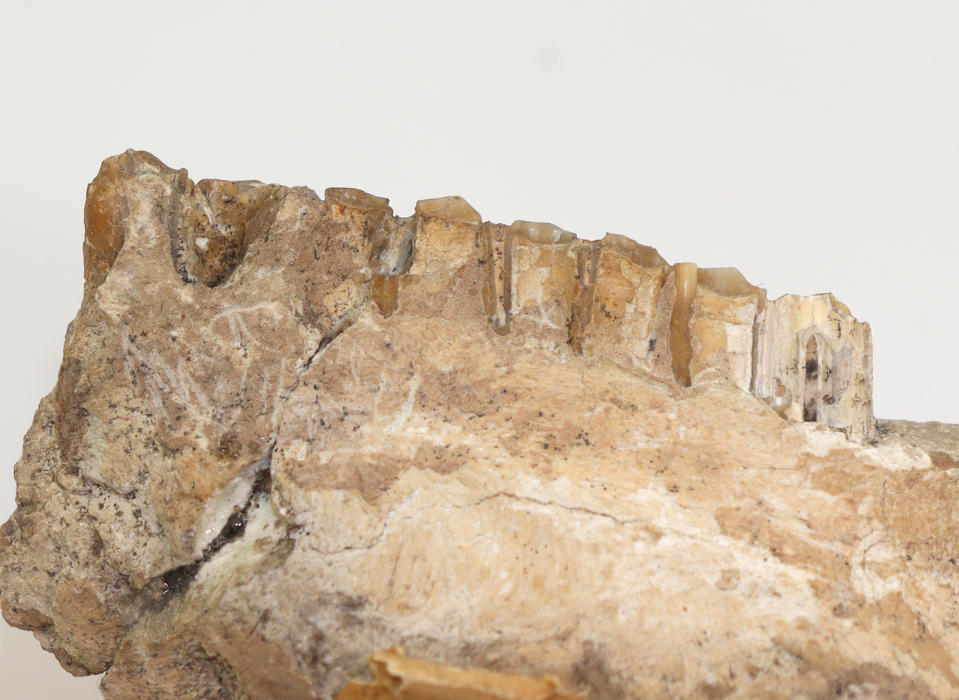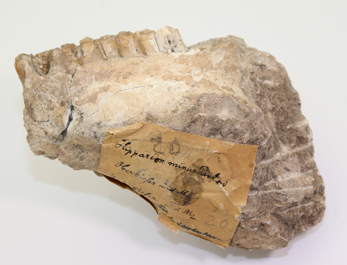 Absolute Rarität: Sehr gut erhaltenes Kieferstück mit drei Zähnen eines dreizehigen Huftieres das den Pferden ähnelt.