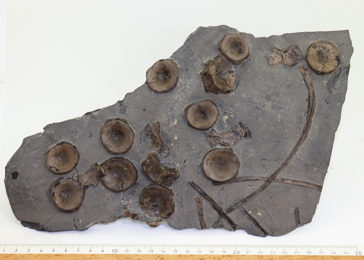 Matrixstück mit 12 Wirbeln, mehreren Fortsätzen und Rippen eines Ichthyosauriers.