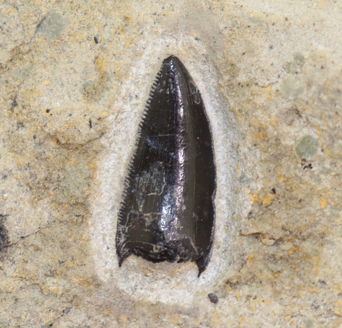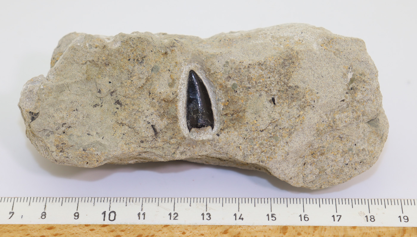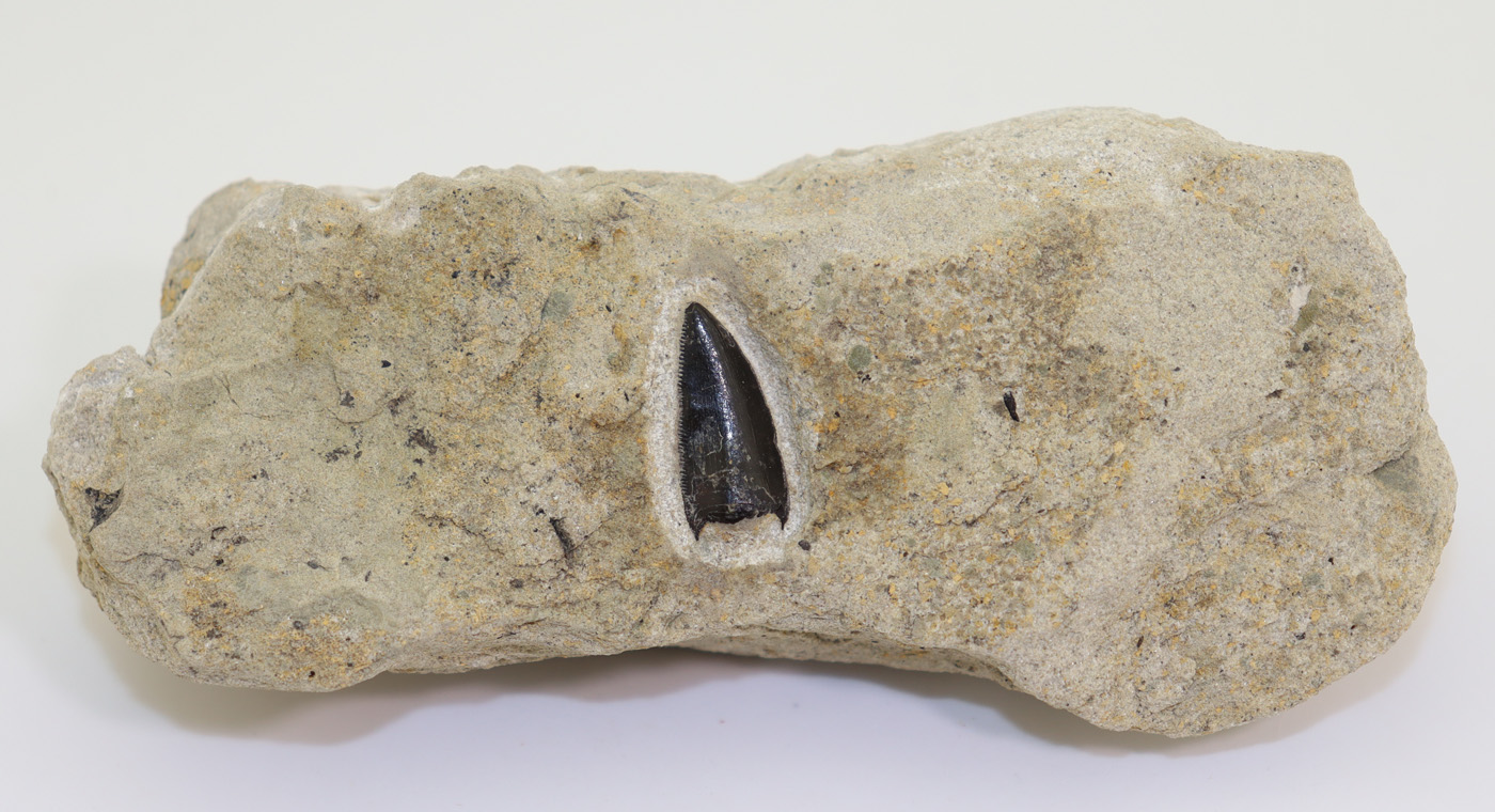 Sehr gut erhaltener, absolut seltener Zahn eines theropoden Dinosauriers auf ein wenig Matrix.